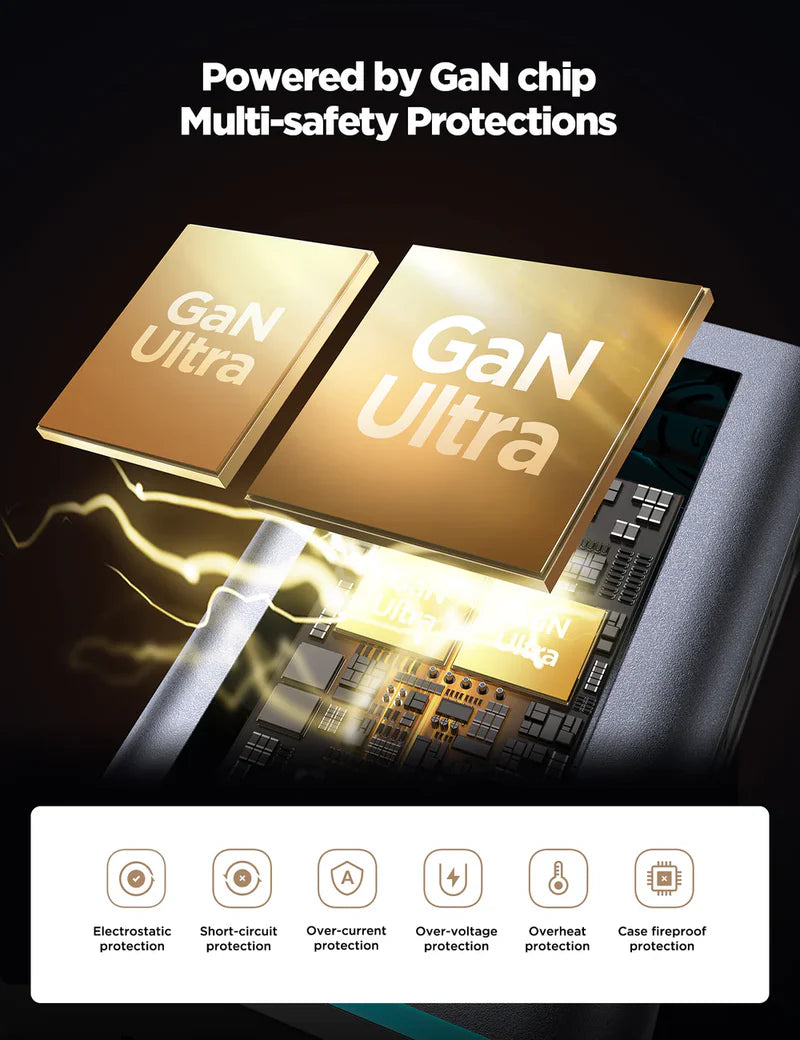 The Joyroom 65W Multi-port Charger offers high-speed charging for USB-C notebooks through its 65W USB-C port. It can power six devices simultaneously with four USB-C and two USB-A ports, delivering a total of 65W. Utilizing the latest GaN technology, it ensures stable charging while minimizing heat. Its 1.5-meter cable provides flexible use, and universal compatibility supports a wide range of phones and tablets. Equipped with six safety protections, including over-current and over-voltage safeguards, this charger delivers reliable and secure performance for your devices. 12 Month Guarantee