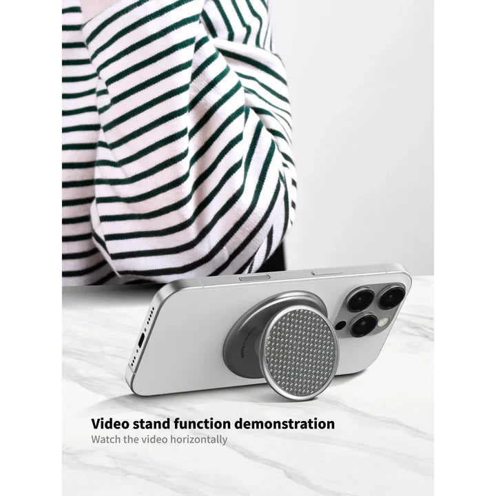 The Puloka ELEVA is a MagSafe-compatible finger grip made from carbon fiber and soft silicone. It provides a secure, comfortable hold for your phone while enabling hands-free use for calls, videos, and photos. Its sleek design works with any device.